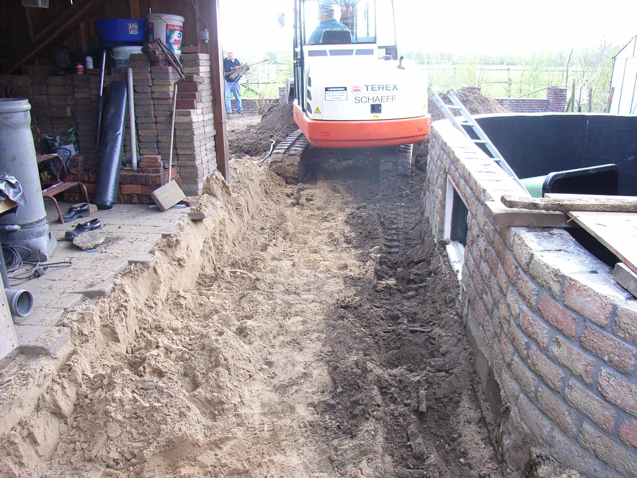 Eerst hebben wij een paar rijplaten moeten leggen aangezien we met een grote spierings bouwkraan de minigraver over het huis moesten zetten. Deze kraan weegt 50 ton dus dan zijn rijplaten op je oprit wel wenselijk.